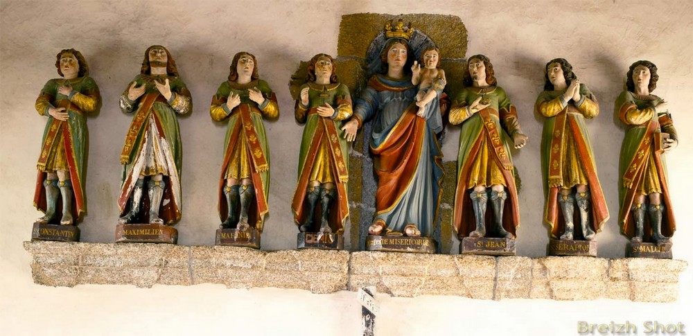 Qui sont ces sept saints ? Ce ne sont pas comme on serait tenté de le croire, les sept saints fondateurs de Bretagne célébrés par le Tro Breizh. Les sept statues du retable de l’autel indiquent clairement qu’il s’agit là des Sept Dormants d’Éphèse. Les noms inscrits sur les socles le prouvent : Constantin, Sérafein, Jean, Denis, Martineau, Marc et Maximilien. Ils sont ceux que la tradition dit avoir trouvés sous le dolmen, et en l’honneur de qui la chapelle a été érigée. Pour l’islamologue catholique, cette vénération rejoint celle des Dormants d’Éphèse, sept jeunes hommes de la bonne société entre 250 et 253, secrètement convertis au christianisme. Arrêtés et interrogés, ils sont emprisonnés, mais parviennent à s’enfuir et se réfugient dans une caverne sur une hauteur de la ville où ils s’endorment avant d’être emmurés et retrouvés vivants, « réveillés » plusieurs années plus tard. Ce mythe commun aux chrétiens et aux musulmans, « comme tout mythe, résiste à l’épreuve du temps en fonctionnant finalement comme les Dormants : il s’endort, se fait oublier, pour mieux se réveiller là où on ne l’attend pas. Il s’adapte et se recompose pour mieux durer », écrit l’anthropologue Manoël Pénicaud.
