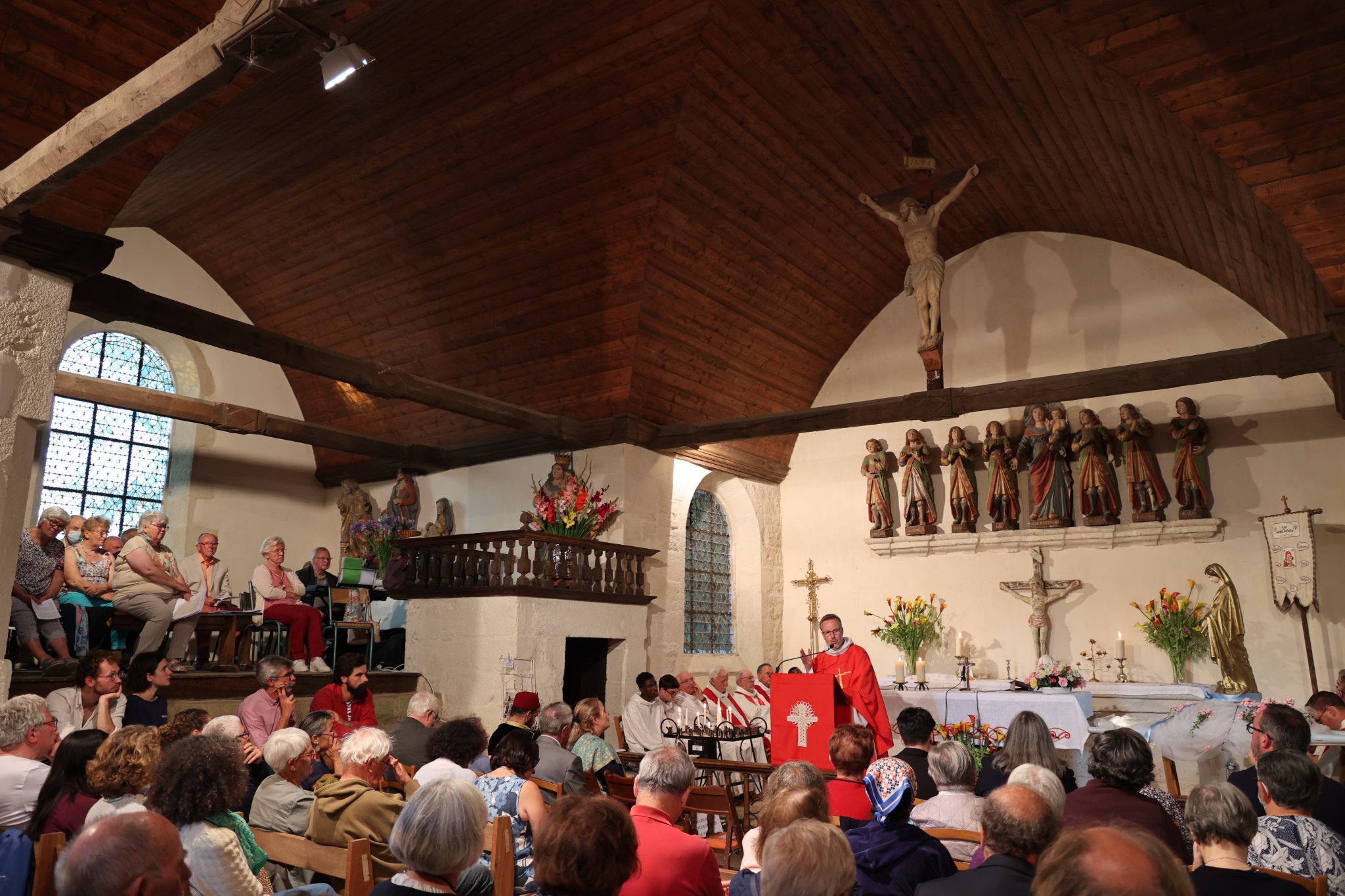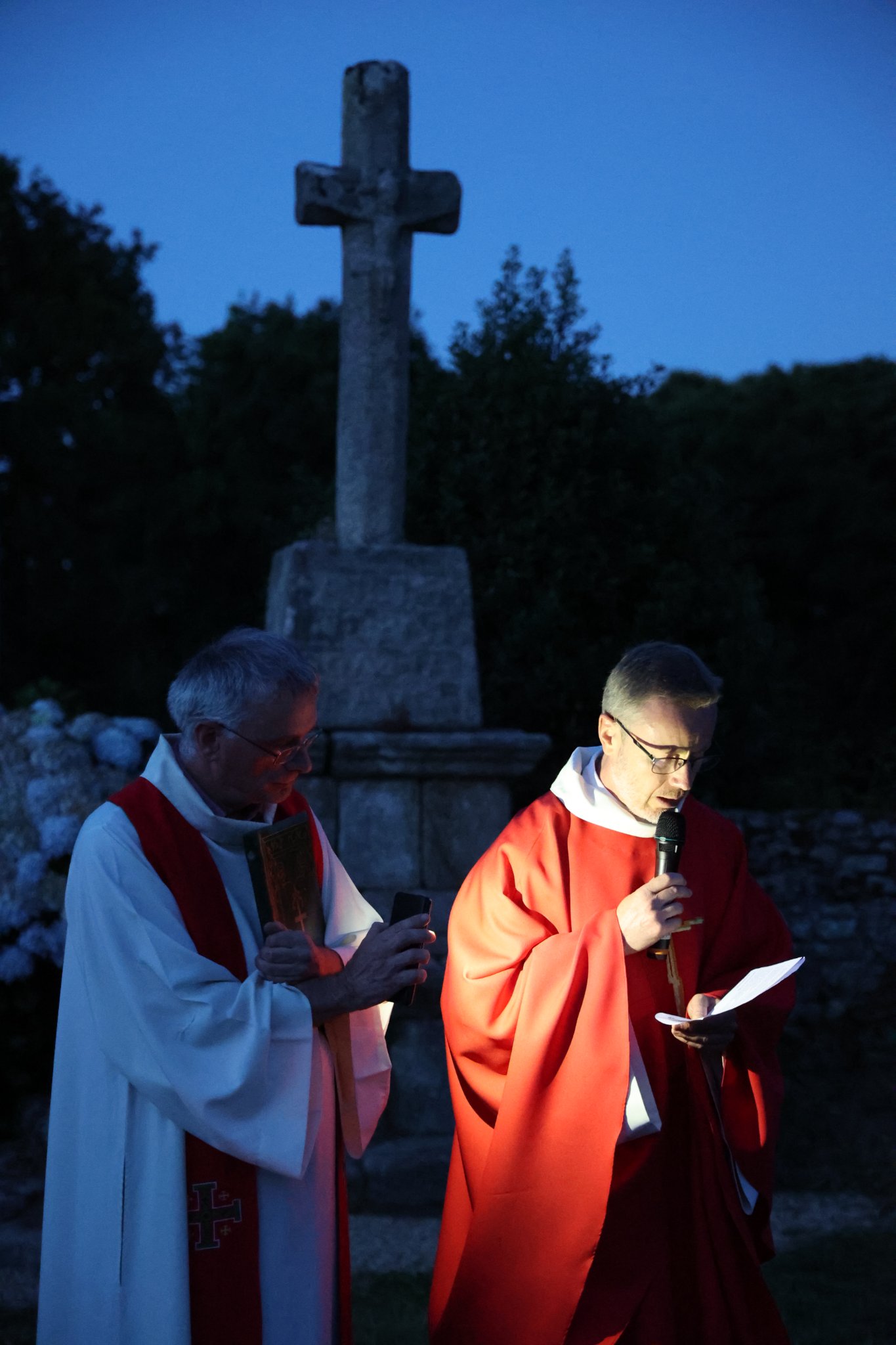 À 20h45, la cloche de la chapelle a appelé à la messe. La chapelle était pleine ; il y avait au moins une vingtaine de personnes à l’extérieur, pour qui la visibilité était difficile, mais la sono prêtée par la mairie atténuait leur frustration… La ferveur des pèlerins était soutenue par la qualité de la célébration : la chorale de la paroisse et son accompagnement à l’orgue (portatif) était au top, les textes bibliques et les intentions de la prière universelle étaient bien lus et l’homélie était riche (quoique dépassant largement les 7 mn recommandées par le pape François…).